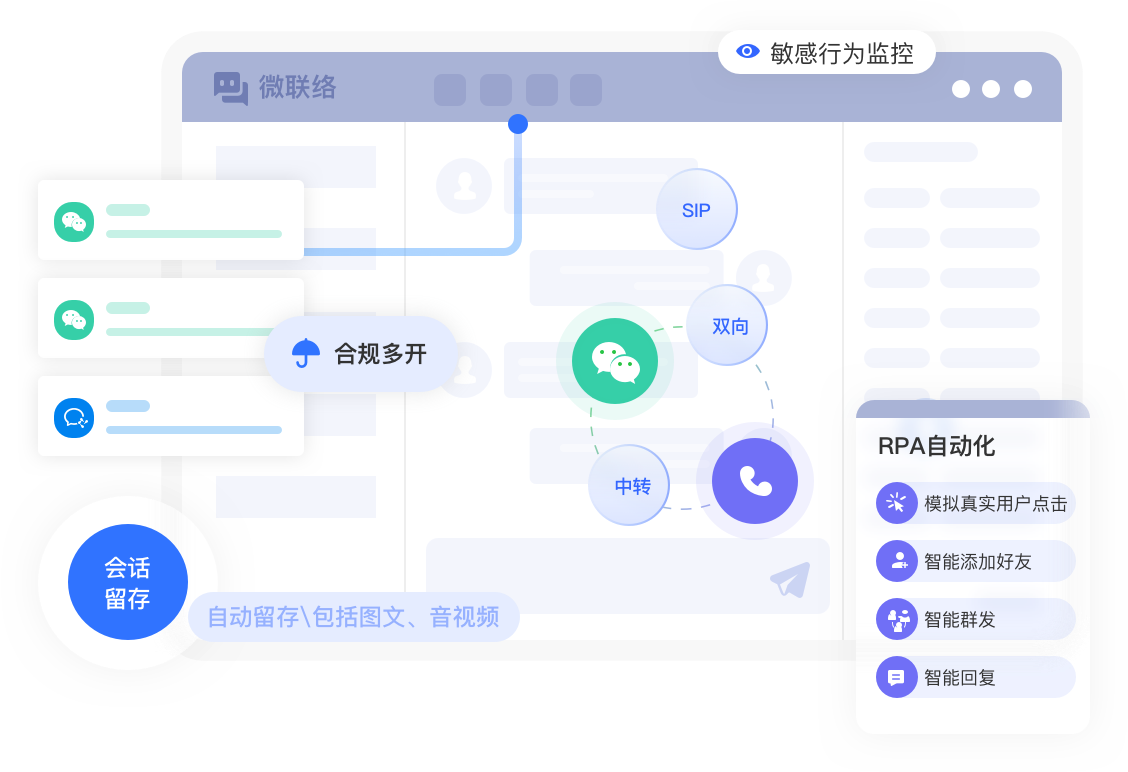 支持微信/企微/QQ社交软件中图文、音视频、文件数据的全储存,可实现敏感词阻断和话术管理